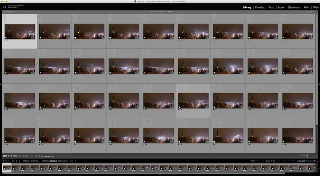 I use Adobe’s Lightroom software for nearly all my post processing, plus a few plugins that I will cover in other posts. I very rarely use Photoshop, but this was one of the few occasions that I did – it is needed to combine all these pictures into one image. I looked through all the images I took of the storm from that viewpoint, as I mentioned above about 750 of them, and added all those with lightning into a Lightroom collection, ending up with 38 pictures.