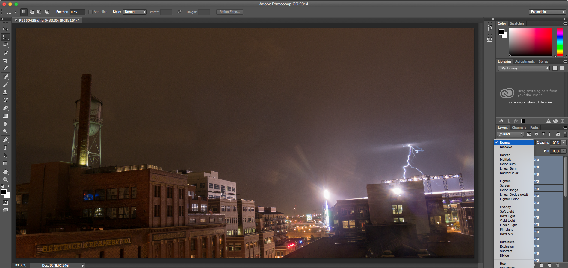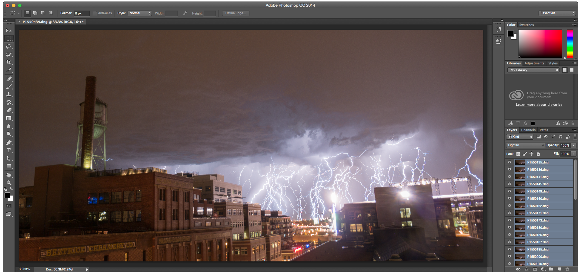You need to select all the layers on the right hand side – click on the first layer, then scroll down and shift-click on the last layer. Then select the pulldown above the layers and change it from “Normal” to “Lighten” and this will give you a composite image showing all the lightning!