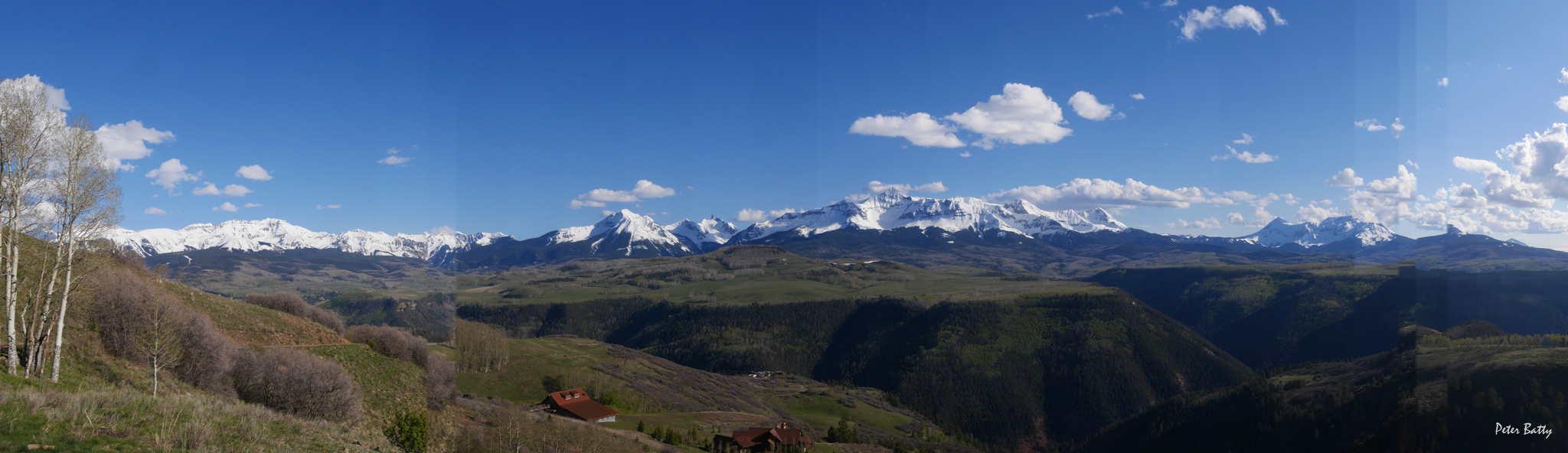 This one is taken in the same general area, a little further up Last Dollar Road, and shows a wider panorama of Wilson Peak and its neighbors, made from 5 overlapping RAW images. This one is 14270×2851 pixels, or 41 megapixels. Another important thing to remember when taking a panorama is that you want to make sure you have a consistent exposure across all the pictures. The easiest way to do this is to press and hold the exposure lock button while you take all the pictures. The exact details of how to do this will vary depending on your camera.