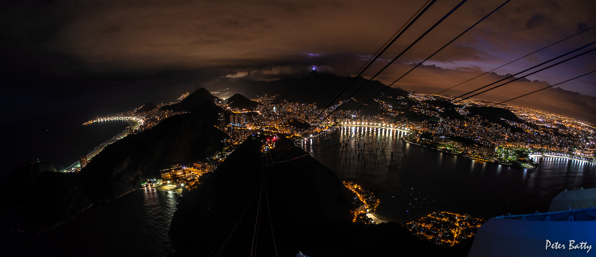 When we were there, about a month before the start of the Olympics, there were actually very few places at the top of Sugarloaf with a view towards the city like this – it seemed as though they were doing lots of remodeling up there, presumably because of the Olympics. In fact the only place I found to get this view was right by the top of the cable car, a spot where at most two people can fit at once. Paula and I are standing there in this selfie, which obviously we took a bit earlier, before dark – and you can see the clouds covering Cristo here.