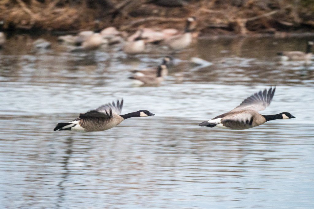 Next is my one bird in flight shot using the animal detection. I took a few others at greater distance where the animal detection didn’t kick in, but on this one I got the rectangle identifying the rear bird’s body. Because it was so dark it wasn’t good conditions for birds in flight – this image was taken at 1/500s and f/5.0, at ISO 2500, with the Leica 100-400mm lens (which was used for all the images here). So there’s some wing blur, though I think the effect is quite nice, and it’s not super sharp, but I think that the focus has locked on very well despite having a pretty busy background.