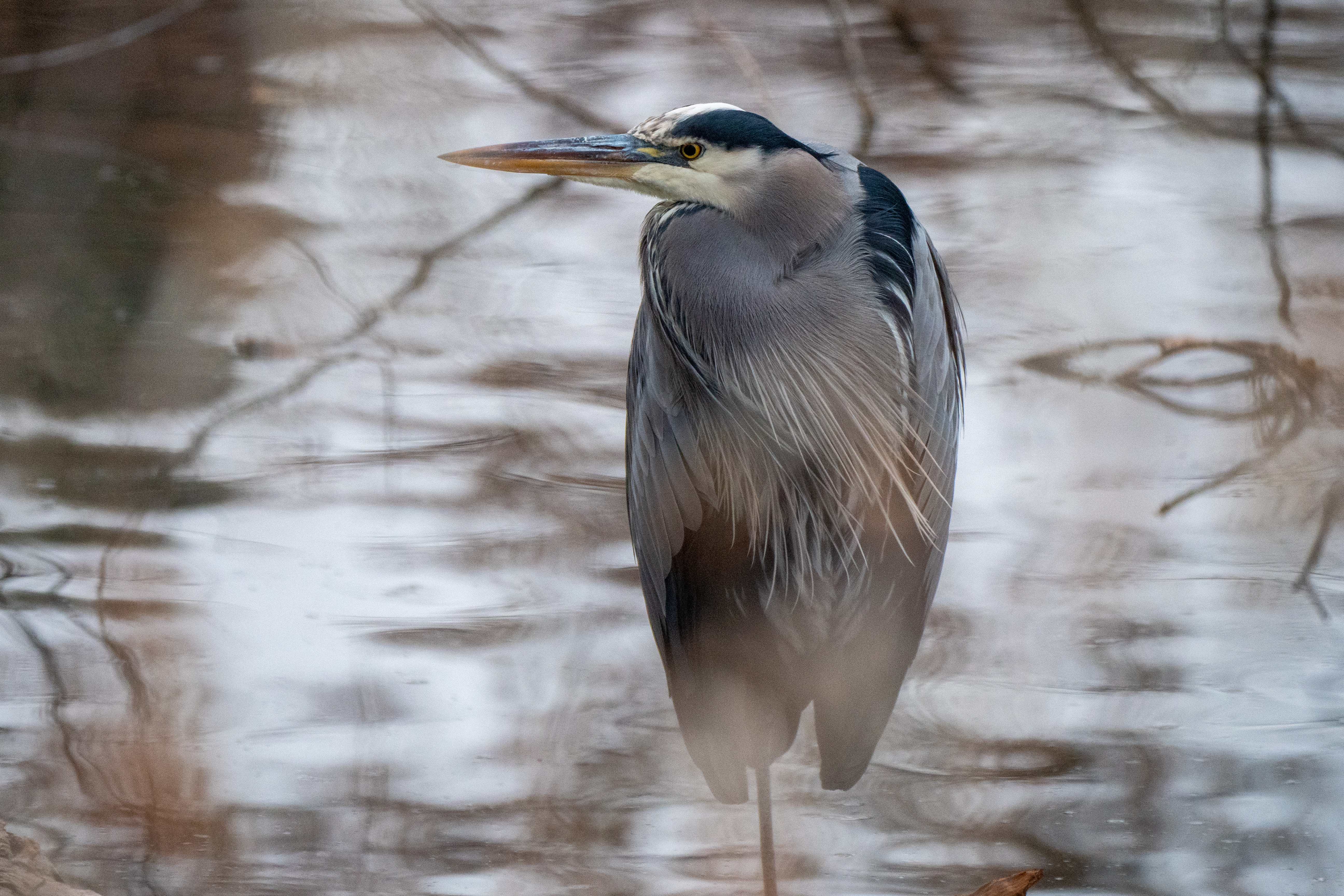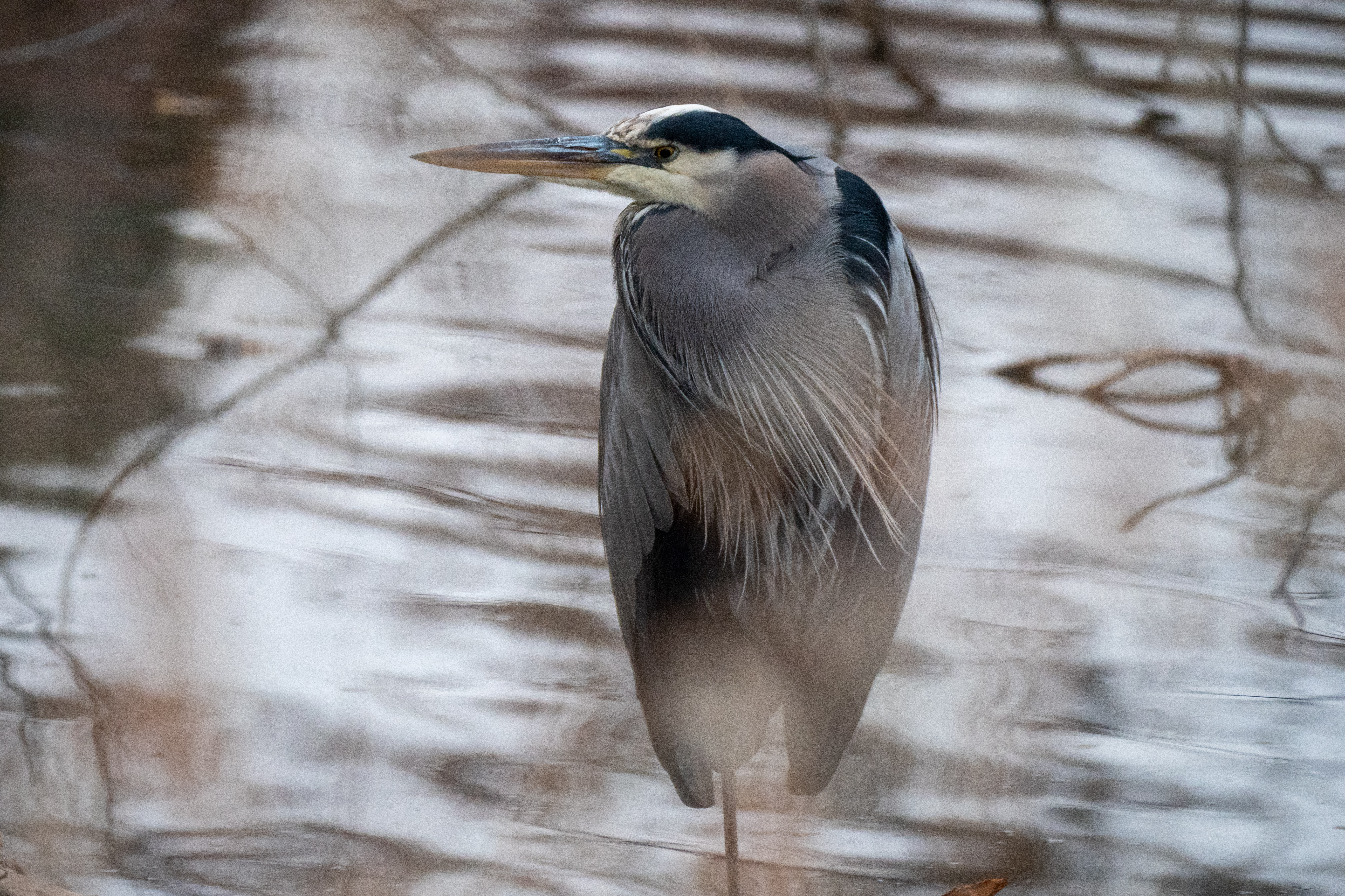 First, this is a black-capped chickadee in the midst of quite a dense tree, but still sharply in focus. And then also a couple of shots of a Great Blue Heron with a number of branches in close proximity.